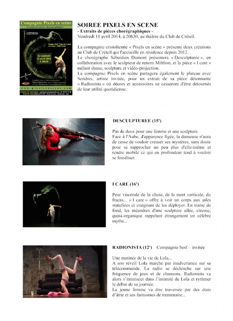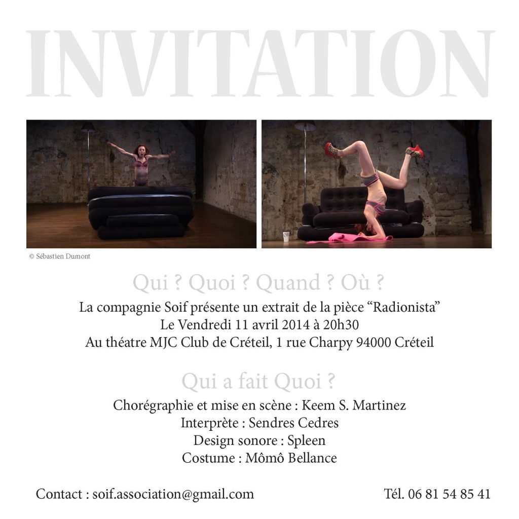 Première présentation publique d’un extrait de la pièce Radionista au Théâtre MJC Club de Créteil le 11 avril 2014. Metteur en scène : Keem S-Martinez, Interprète: Sendres.